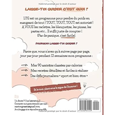 LAISSE-TOI GUIDER C'EST QUOI ?LTG est un programme pour perdre du poids en mangeant de tout ! TOUT, TOUT, TOUT ! A VOUS les raclettes, les blanquettes, les pizzas, les pastas ! Il suffit juste de compter ! Pas de panique, c'est facile ! POURQUOI LAISSE-TOI GUIDER ?Parce que vous n'avez qu'à suivre page par page, jour par jour pendant 12 semaines mon programme :- Mes 90 assiettes classées par calories- Mes recettes détaillées et faciles à réaliser- Des défis journaliers "sport et bien-être". Et le tout, placé sous le signe de l'humour ! ;)